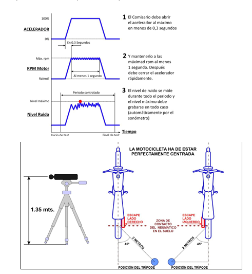 - Nuevo reglamento de homologación (RD-ASEP); Prueba «dinámica». Medida del valor máximo de ruido con el vehículo en aceleración en un tramo recto (p.e. entre 20 y 60 Km/h en 2ª o 3ª, zona 3.000-6.000 rpm a 7,5 m de distancia) < 80 dBA* *según ficha técnica. Por lógica la distancia superior de medida supondrá un valor inferior al estático
