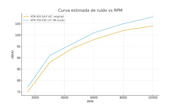 PARALELISMOS: Se homologan vehículos (hay motos de calle con +200 CV y +300 Km/h) cuya velocidad potencial es mas del doble de la permitida legalmente y su regulación, con mayor o menor grado de asistencia es dosificable por la muñeca del conductor/piloto. Para controlar y penalizar rebasamientos ilegales existen radares de velocidad tal como podrían implantarse radares de ruido (p.e. en ZBE). La emisión de ruido también es regulable/dosificable, ya que es función de las r.p.m. del motor (aunque influyen muchos otros parámetros). En una simulación realizada a partir de valores experimentales y datos de fichas técnicas, vemos que el ruido «estático» aumenta unos 10 dB entre 4000 y 8000 r.pm.
